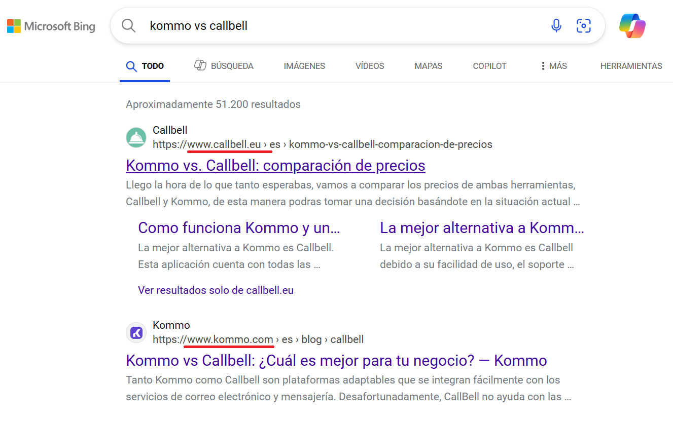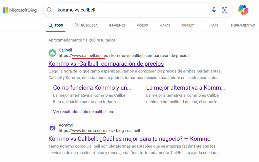 En la siguiente búsqueda podemos ver un ejemplo al colocar la frase «Kommo vs Callbell» podemos apreciar que los dos primeros resultados pertenecen a dichas empresas, por lo cual podemos concluir que su contenido no será objetivo, ya que dichas acciones simplemente se realizan para conseguir tráfico de esas búsquedas: