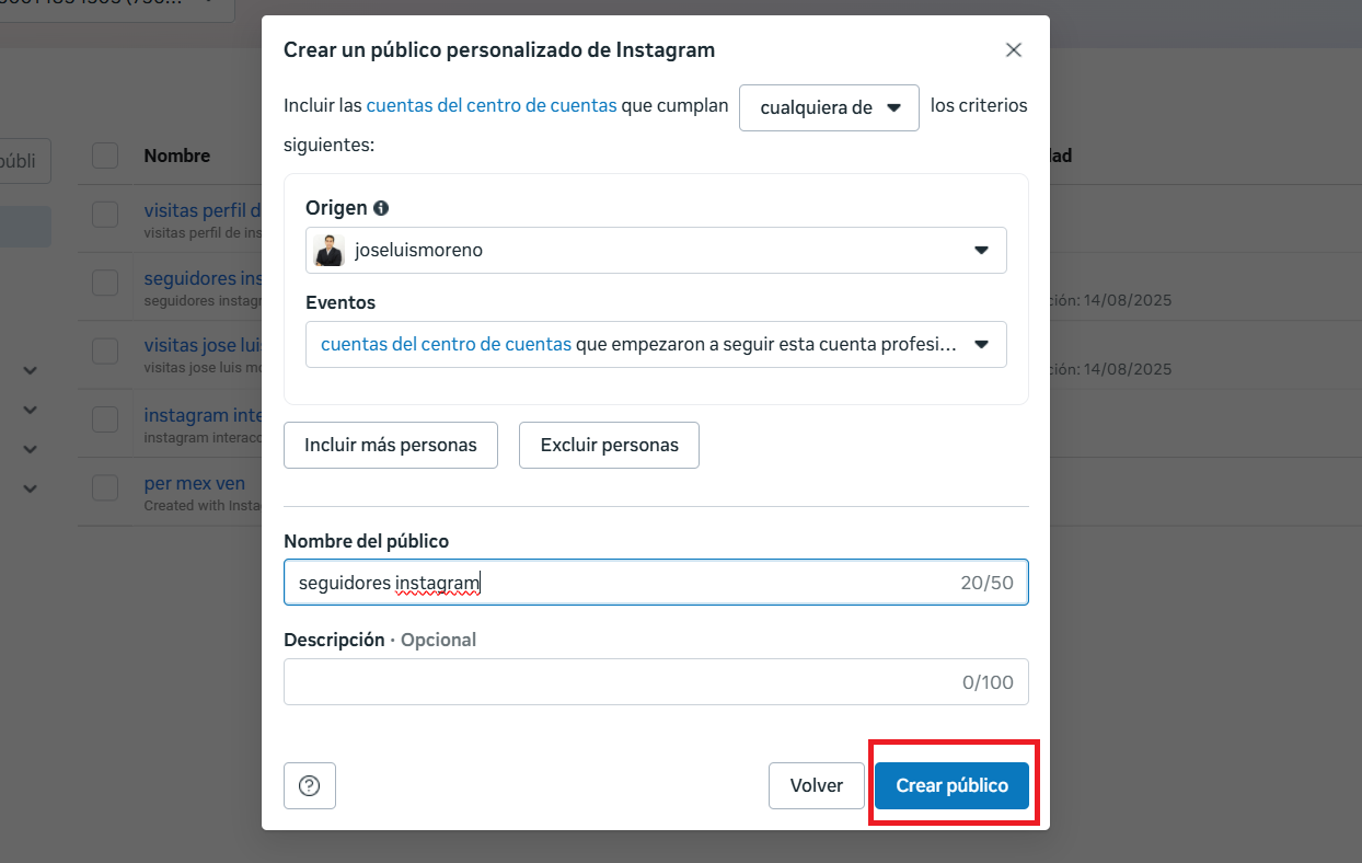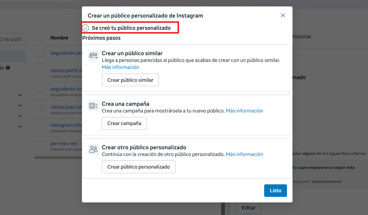 Aparecerá un mensaje que nos indicará que se creó nuestro público personalizado.
