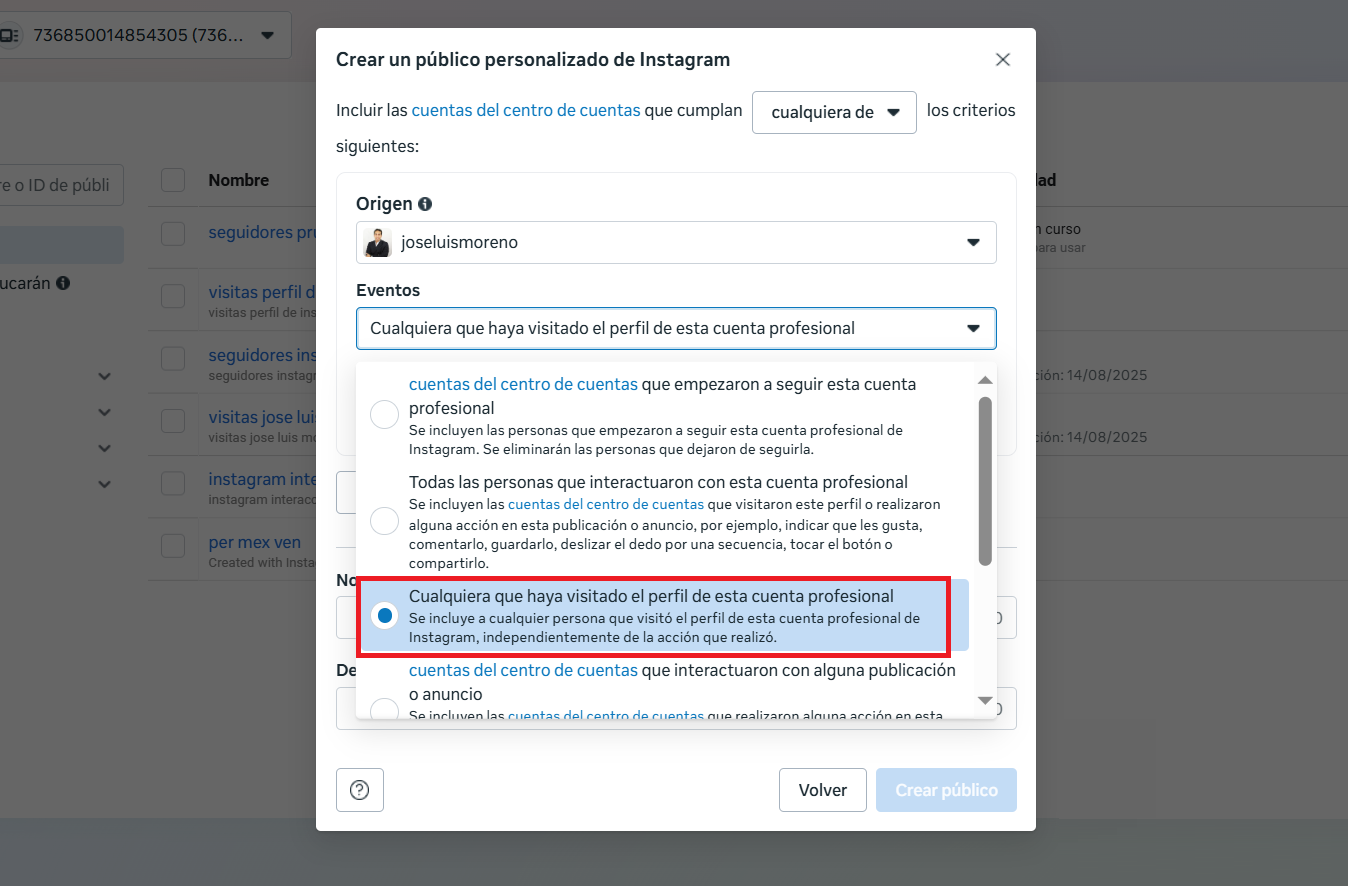 Existe una variante de este público, el cual consiste en las personas que visitaron nuestro perfil de Instagram. En este caso repetimos el mismo procedimiento, solo que elegimos la alternativa «cualquiera que haya visitado el perfil de esta cuenta profesional de Instagram»