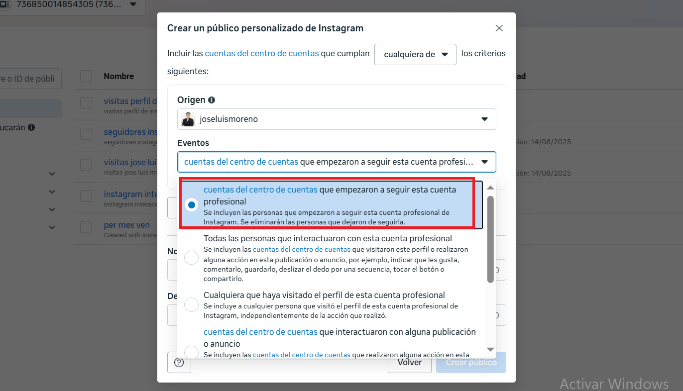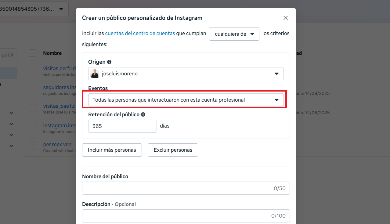 Aparecerá una ventana como la que se muestra a continuación, en donde se puede ver la fuente de los datos (Instagram) y en la parte de eventos veremos una opción que dice «Todas las personas que interactuaron con esta cuenta profesional», hacemos click en esa opción.