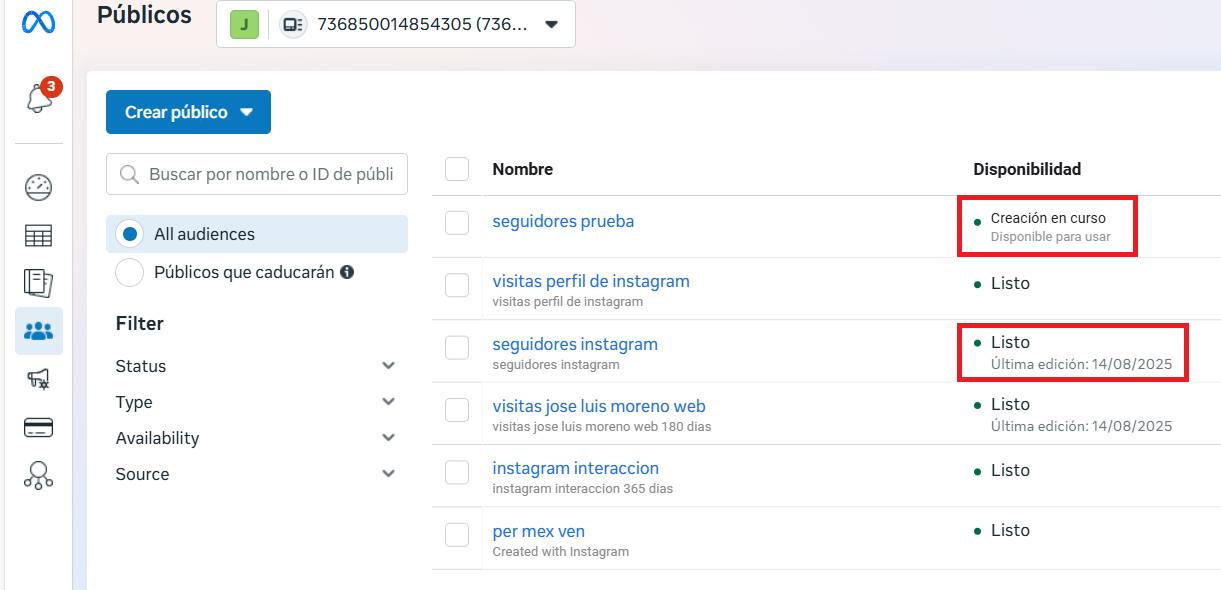 Al salir o hacer click en «listo» seremos enviados a la sección de públicos. Inicialmente aparecerá un mensaje que dice «creación en curso», y cuando la creación esté terminada (un proceso que dura uno o dos días), aparecerá un mensaje que dice «listo». Es importante destacar que una vez creado el público ya podremos utilizarlo en nuestra campaña de anuncios.
