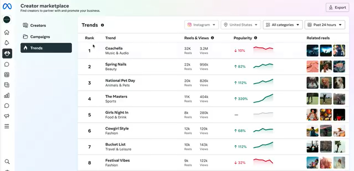 Meta anunció la herramienta de tendencias (trends) en su marketplace de creadores de Instagram (influencers). En esta herramienta podemos ver los últimos «temas del momento» o contenidos que están marcado tendencia en Instagram. Esto es muy útil para ser efectivos en ciertas fechas festivas o aprovechar temas virales, por ejemplo, si es el día nacional de las mascotas en Estados Unidos, y dicha celebración se encuentra en tendencia en Instagram, podemos ver qué contenidos (y qué influencers) se están destacando en dicho tema.