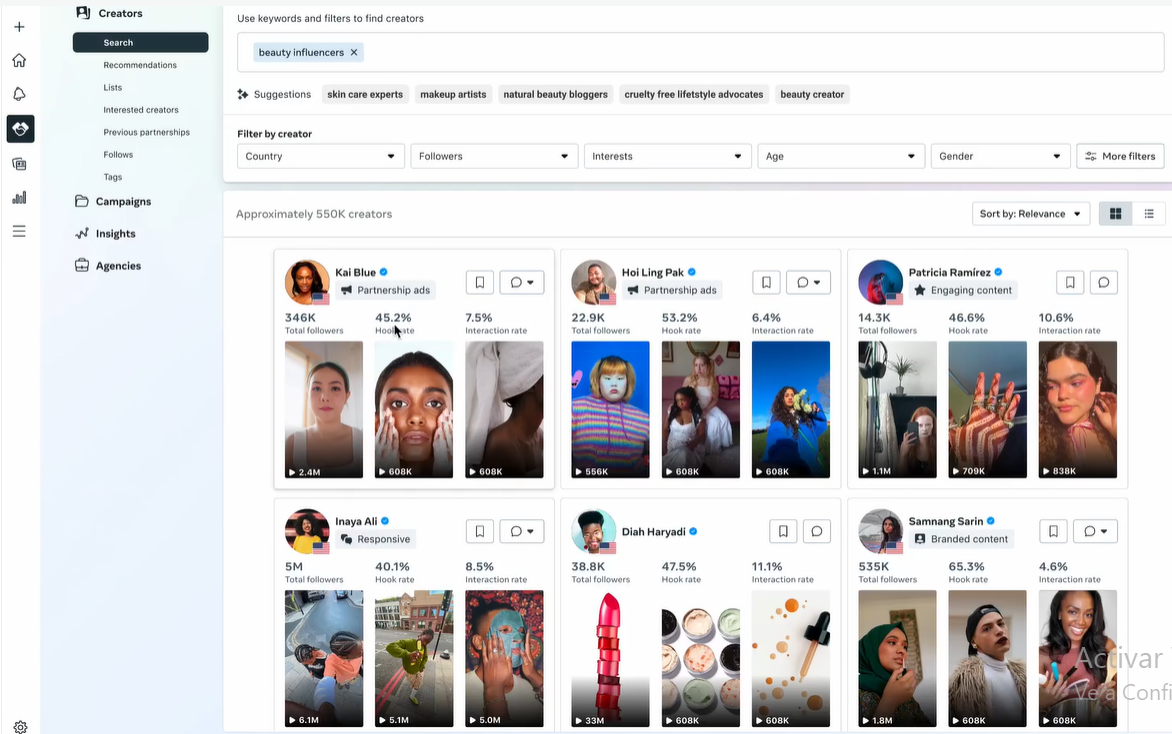 Otra noticia destacada es la función de buscador en el marketplace de creadores de Instagram, en el cual, además de hacer búsquedas por nombres, también puede realizar búsquedas por temas o especializaciones, por ejemplo, podemos colocar «influencers de belleza» (beauty influencers) y aparecerán diferentes influencers relacionados con ese sector. Esta herramienta permite que las empresas puedan encontrar influencers de determinados sectores o rubros de negocio.
