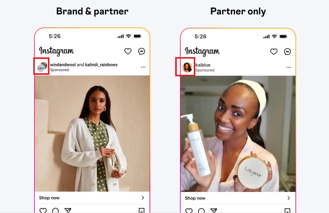 Ahora los anuncios de asociación podrán mostrar a todos los actores involucrados, por ejemplo, en la captura que aparece a continuación, podemos ver en el lado derecho el mensaje clásico de «patrocinado por» y solo el perfil del influencer (partner only), mientras que en el lado izquierdo podemos ver la nueva función que permite mostrar el perfil del influencer junto al perfil de la empresa patrocinadora (brand and partner).