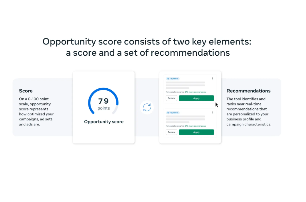Otra noticia destacada es el puntaje de oportunidad en anuncios, el cual consiste en una escala que va del 0 al 100 y nos indica qué tan optimizado está nuestro anuncio. Este indicador nos puede servir como referencia para saber si aún faltan hacer mejoras en nuestro anuncio. Este indicador es similar al indicador de calidad de Google Ads (el cual tiene 4 niveles: malo, regular, bueno y óptimo), el cual también sirve para saber qué tan optimizada está una campaña de anuncios. Es importante destacar que este indicador no mide «rendimiento», sino «potencial» de un anuncio o campaña en Meta Ads.