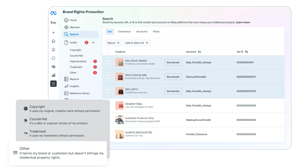 Meta Ads ha mejorado su plataforma de protección de derechos de marca (seguridad de la marca), ya que ahora también permite ver «anuncios» de personas o empresas infractoras que están utilizando nuestra marca comercial. La plataforma menciona que la herramienta no se limita a la detección de nuestra imagen o texto de marca escrito, sino que también puede detectar cuando el infractor «intenta» presentar un anuncio «ocultando» nuestra marca para evadir los controles o proceso de supervisión de Meta. Por ejemplo, un anunciante infractor podría intentar usar la palabra modificada CHAN3L para ocultar la marca CHANEL. Otro caso sería cuando el anunciante infractor muestra ciertas fotografías de un producto con una marca comercial (sin tener el permiso oficial para promocionarla), pero tratando de que la imagen de la marca se vea lo menos posible en la fotografía.