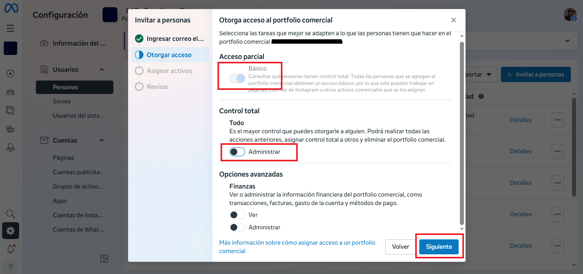 A continuación, se le asignará el nivel de acceso al portafolio comercial, por defecto estará la opción «acceso parcial», pero si deseamos, podemos darle control «total»