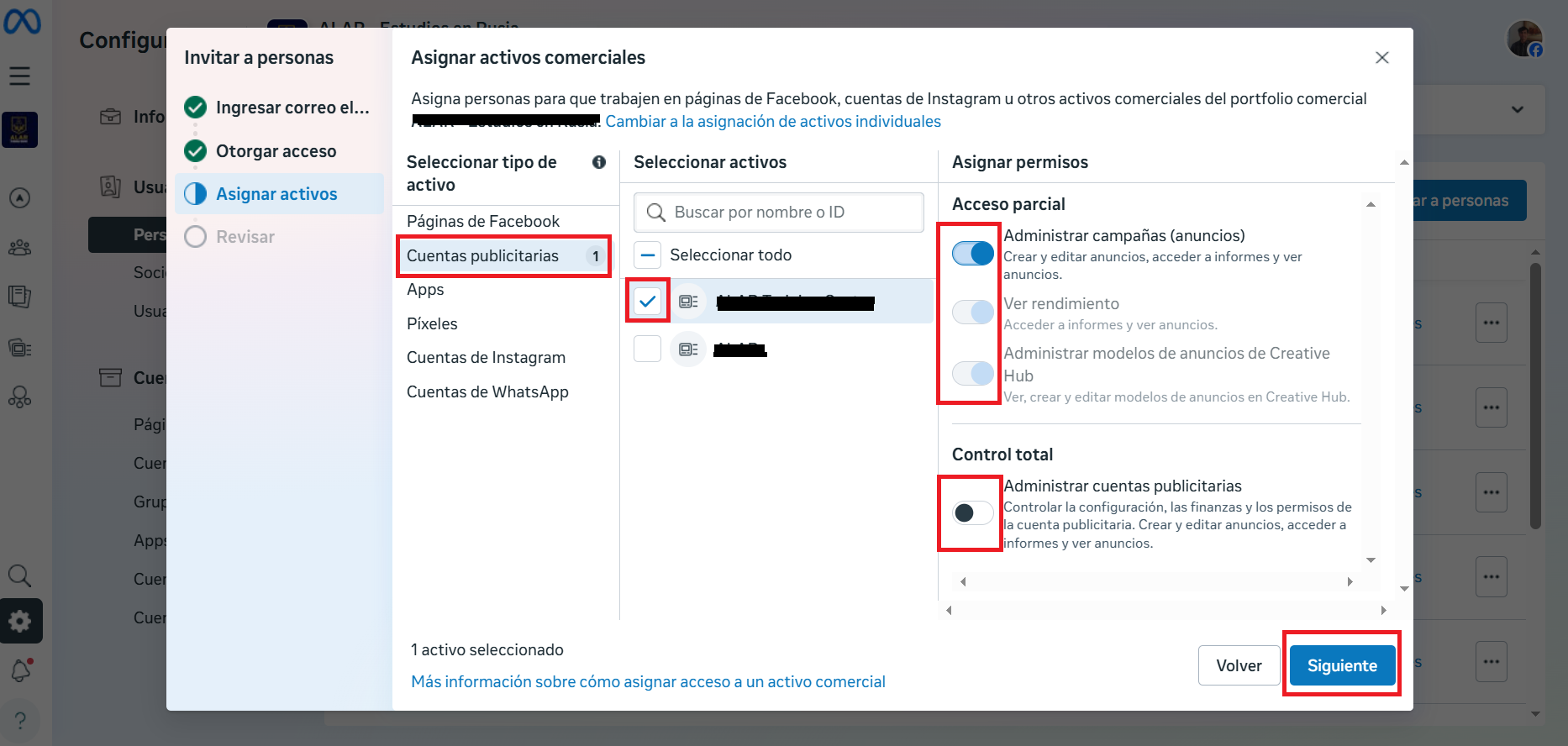 Al seleccionar un activo (por ejemplo una cuenta publicitaria), podremos establecer el nivel de permisos correspondiente. En el caso de la cuenta publicitaria existen 4 niveles de permisos: Administrador de campañas, ver rendimiento/estadísticas, administrar modelos de anuncios de Creative Hub y por último está el nivel «control total» (máximo nivel)
