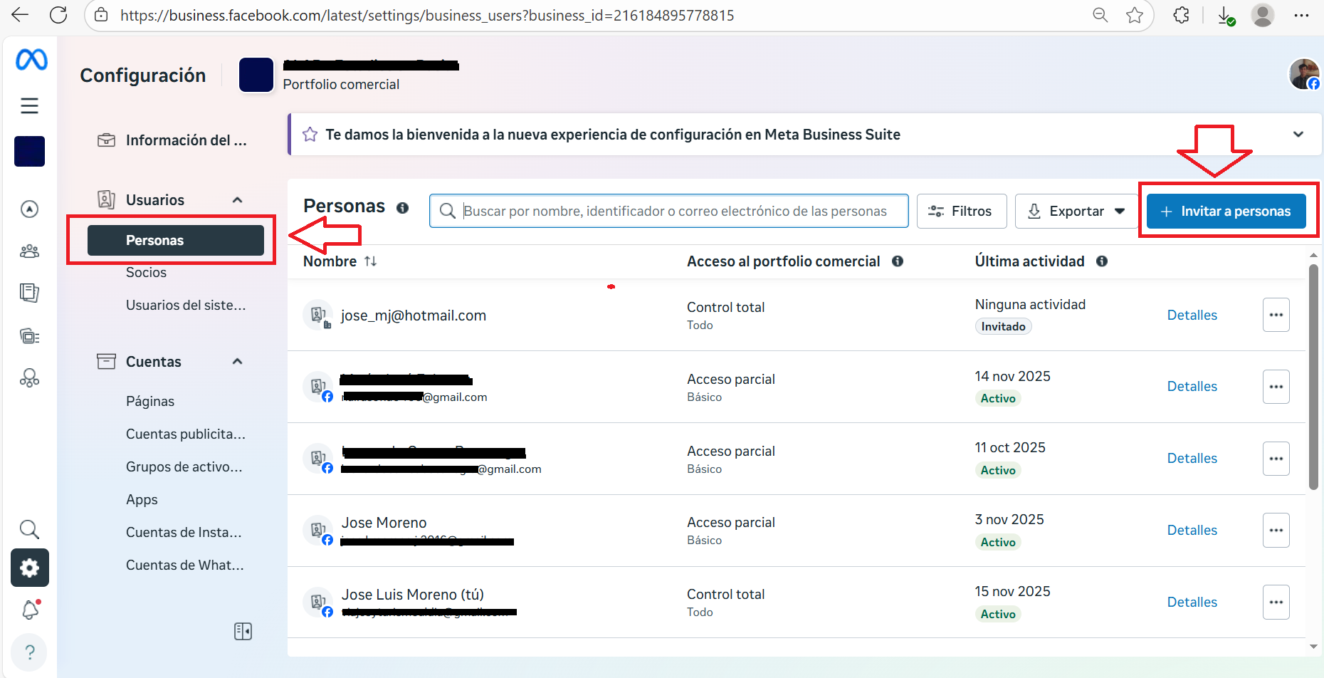 Para añadir un usuario a nuestro portafolio comercial, debemos ir a business.facebook.com vamos a la parte que dice «personas» (se encuentra en la sección «usuarios») y luego hacemos click en el «botón azul» que se encuentra en el lado derecho que dice «invitar a personas».