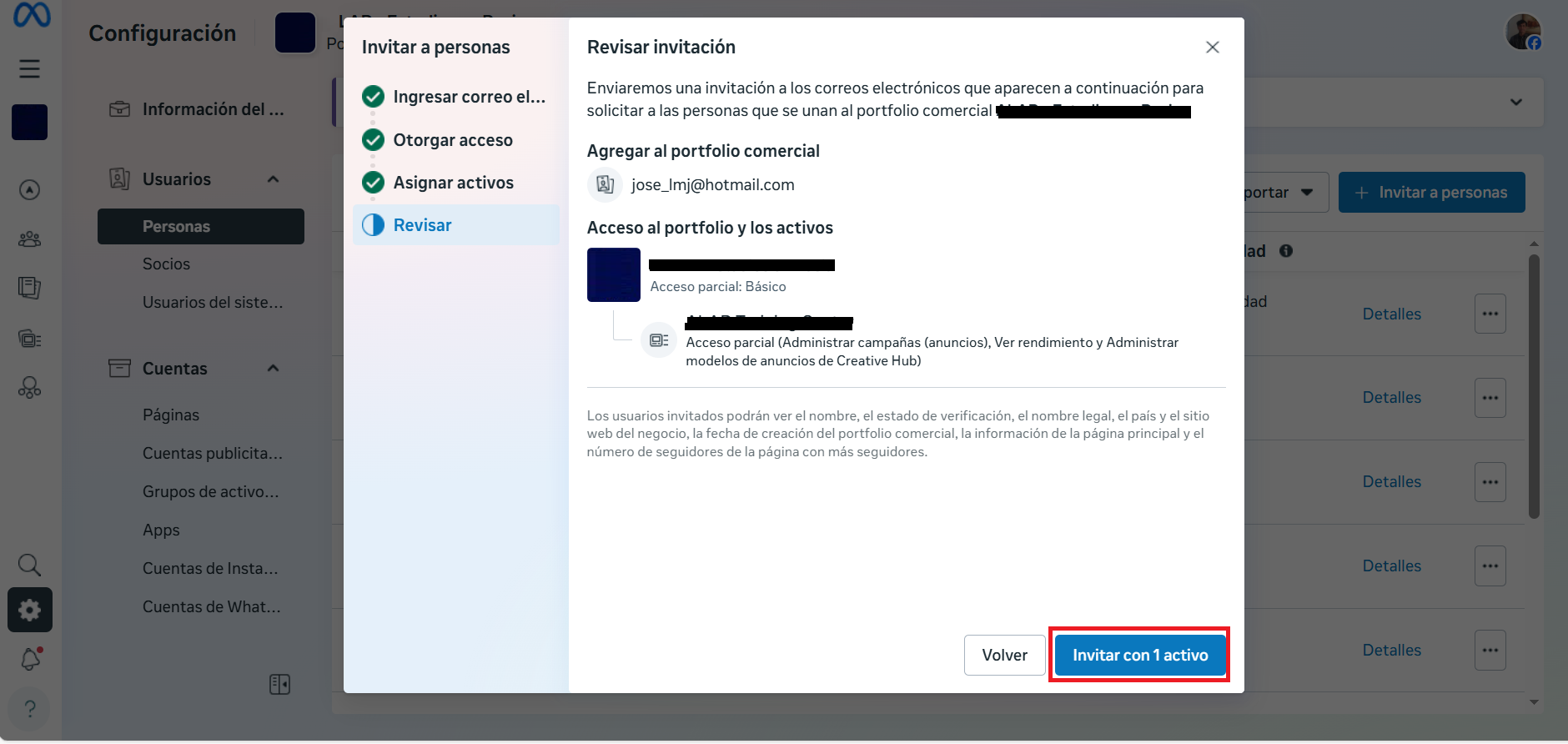 A continución, podremos ver un resumen de todos los activos asignados y el nivel de permisos correspondiente, si todo está conforme, simplemente debemos hacer click en el botón que dice «invitar con x activos»