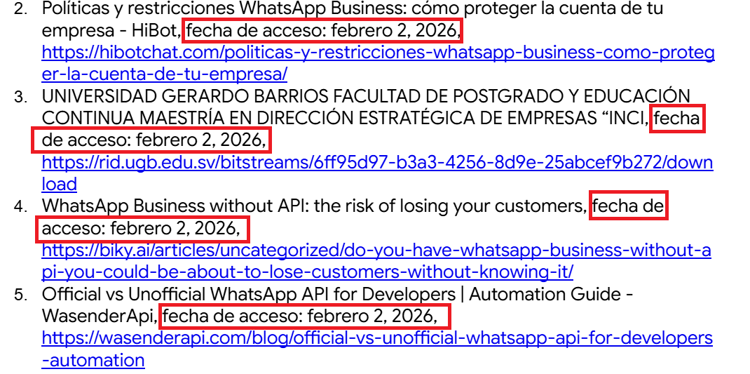 Una de las maneras más efectivas de detectar estudios o reportes desfasados, son las fuentes del mismo. Si se va a hablar de normas de WhatsApp Business, lo más recomendable es que la mayoría de fuentes sean los canales oficiales del propio WhatsApp Business (en donde se encuentran las normas) y no sitios web externos que no se especializan en normas o que simplemente hacen un «resumen» de algunas normas.